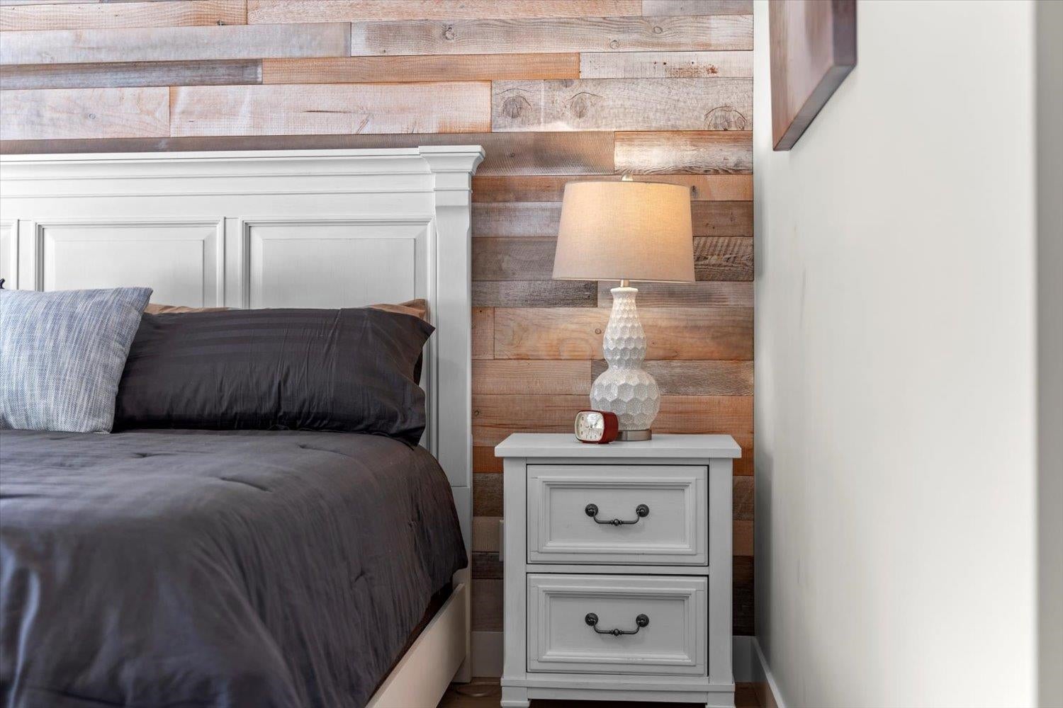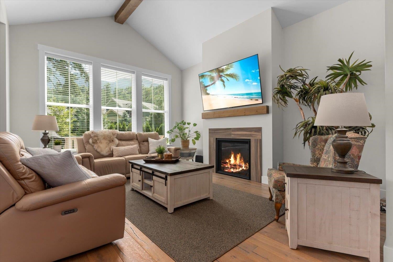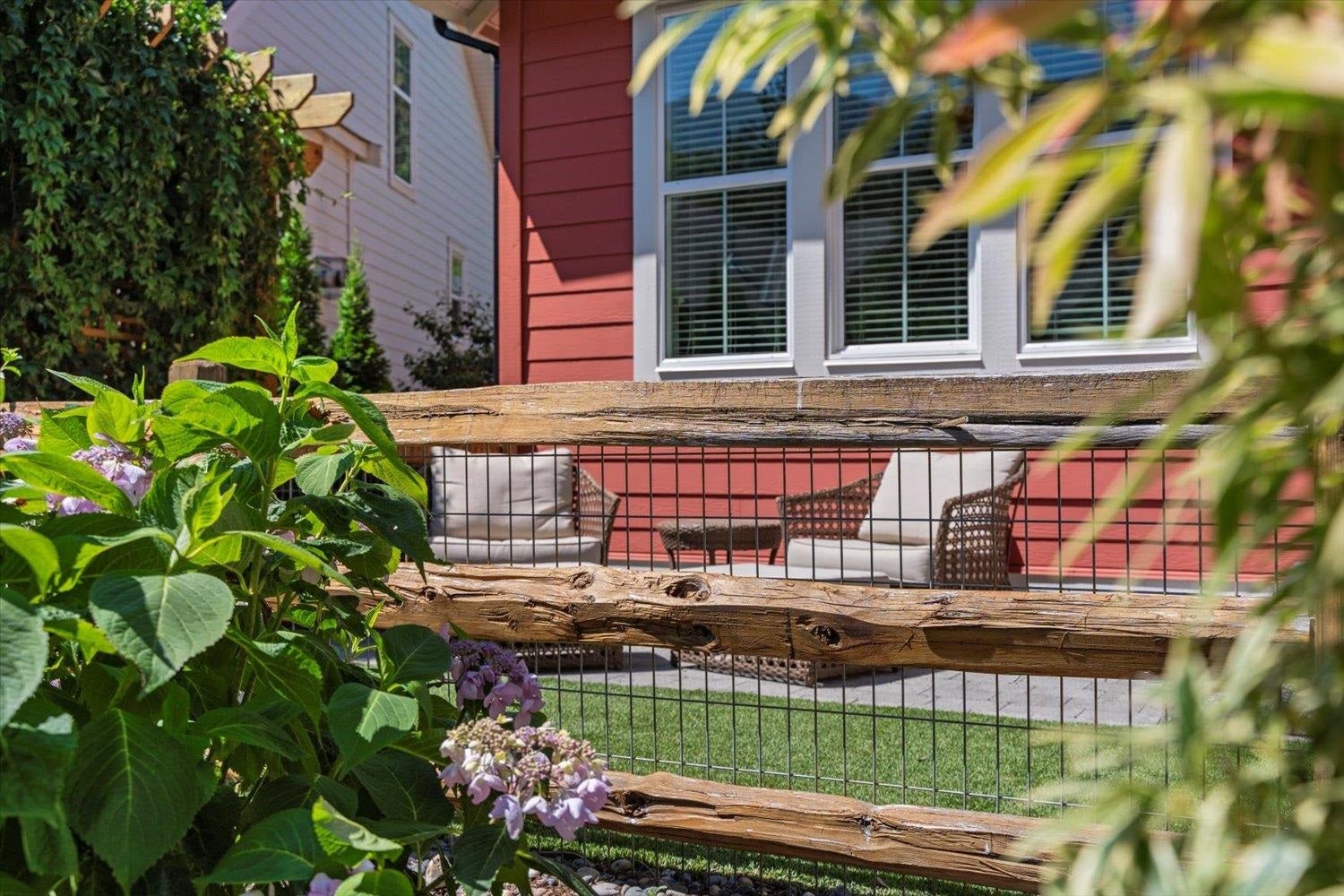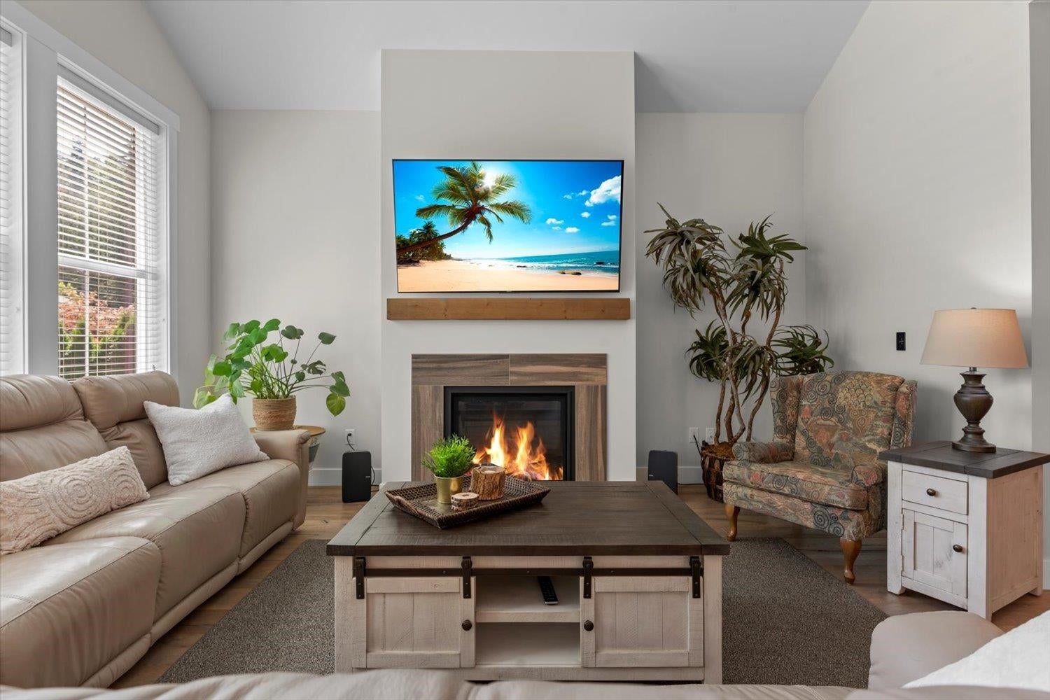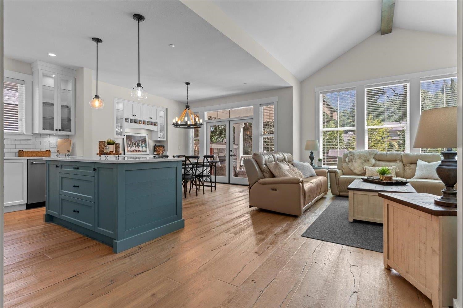This coveted 2 bed + den rancher blends modern farmhouse charm with elevated design, boasting vaulted ceilings, wide-plank hardwood floors & barnwood feature walls. Open-concept layout designed for effortless living and entertaining. Chef-inspired kitchen has s/s appliances & quartz counters and flows seamlessly into a dining area & spacious great room. Primary suite w/ ensuite & walk-in closet. Generous 2nd bdrm, full bath, and versatile den ideal for media room / home office or 3rd bdrm. French doors open to an expansive patio w/ outdoor fireplace. Deluxe 2 car garage w/ epoxy floor & wall organizers! Bonus A/C & exterior gemstone seasonal lighting. Creekside Mills is a gated community surrounded in nature offering a resort-inspired lifestyle, community gardens & scenic walking trails.