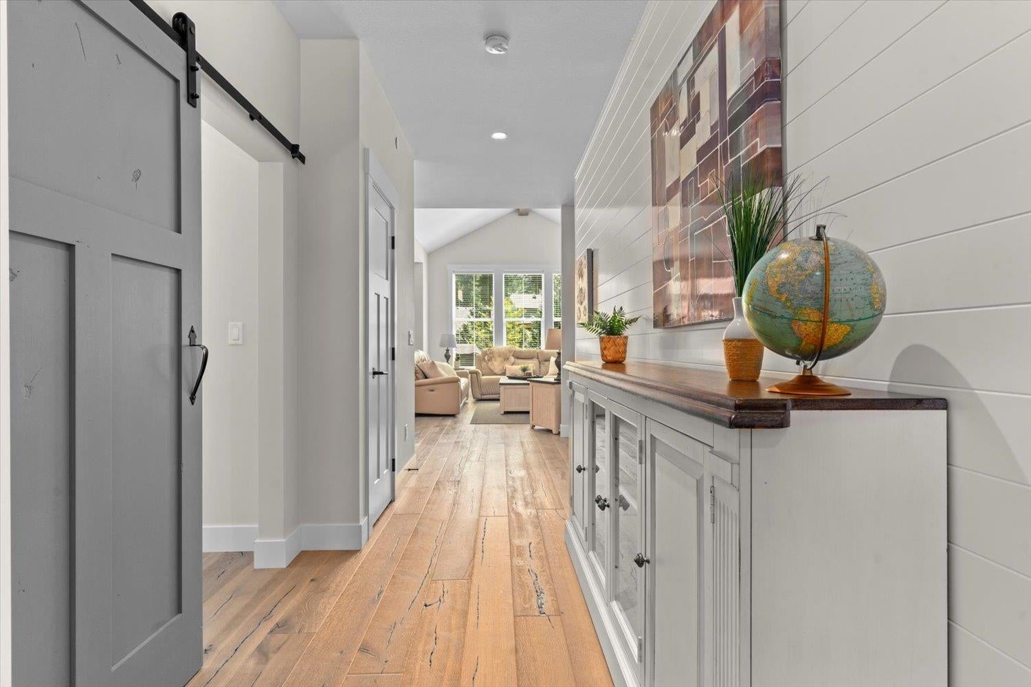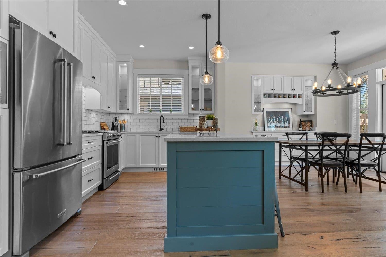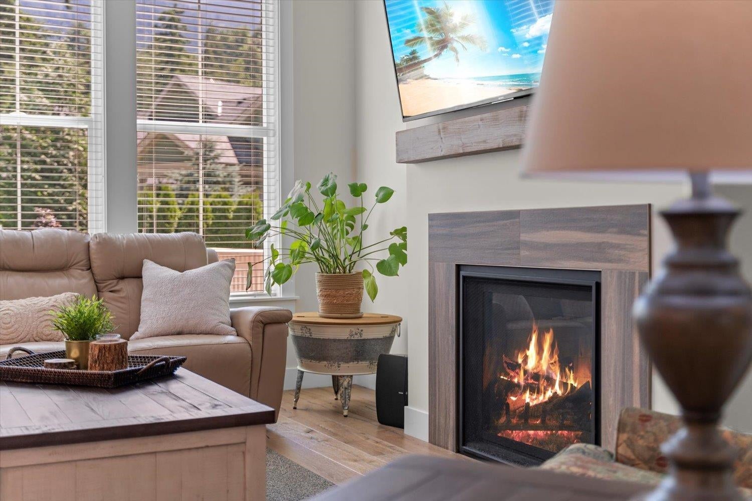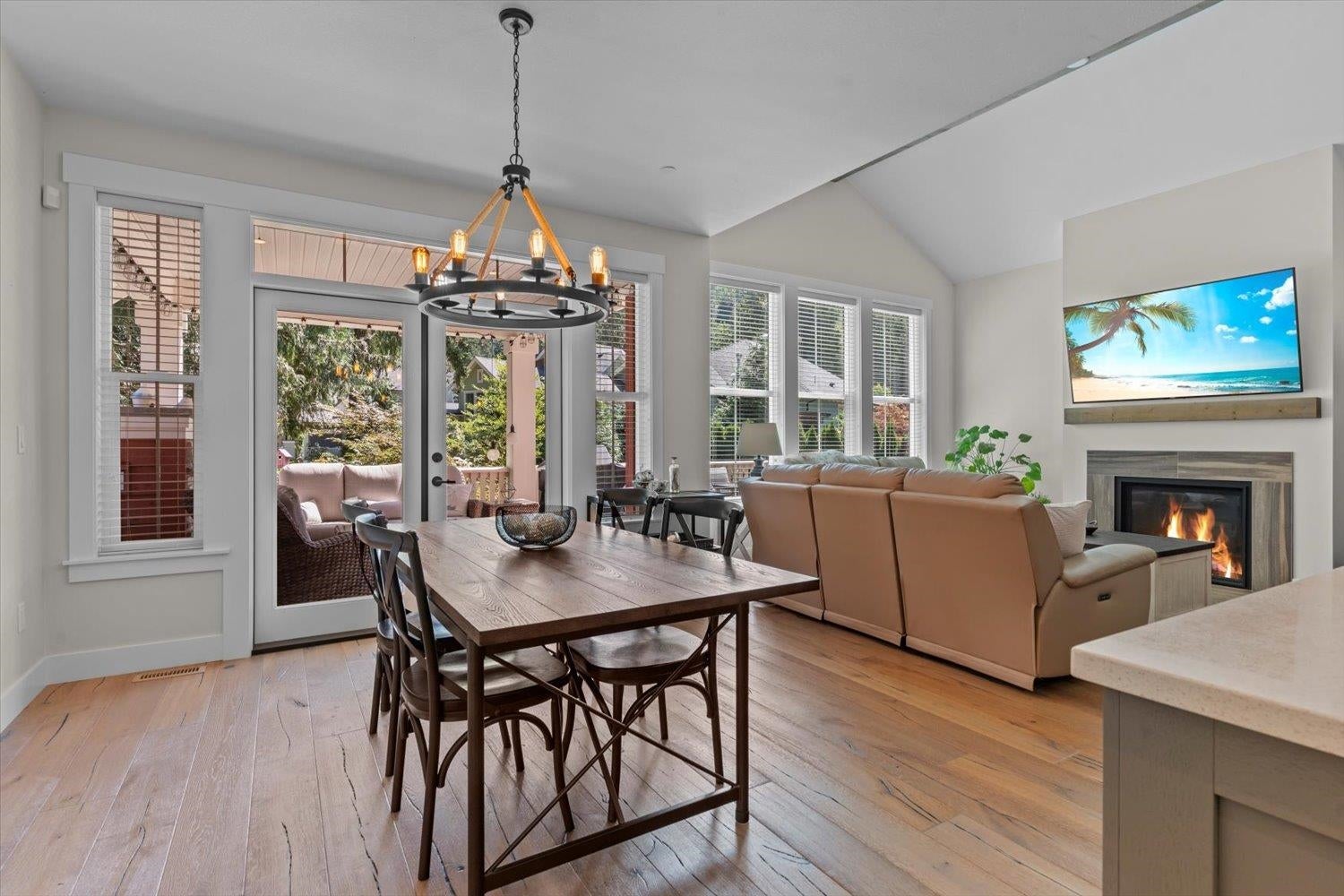 This coveted 2 bed + den rancher blends modern farmhouse charm with elevated design, boasting vaulted ceilings, wide-plank hardwood floors & barnwood feature walls. Open-concept layout designed for effortless living and entertaining. Chef-inspired kitchen has s/s appliances & quartz counters and flows seamlessly into a dining area & spacious great room. Primary suite w/ ensuite & walk-in closet. Generous 2nd bdrm, full bath, and versatile den ideal for media room / home office or 3rd bdrm. French doors open to an expansive patio w/ outdoor fireplace. Deluxe 2 car garage w/ epoxy floor & wall organizers! Bonus A/C & exterior gemstone seasonal lighting. Creekside Mills is a gated community surrounded in nature offering a resort-inspired lifestyle, community gardens & scenic walking trails.